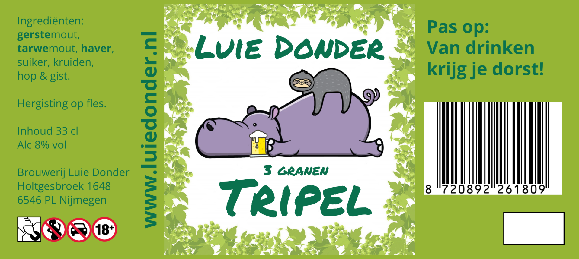 | Luie Donder - Quadrupel 33cl 10% | € 2,90 | Donker, zwaar, lichtbitter, klein zoetje met heerlijke hopsmaken |