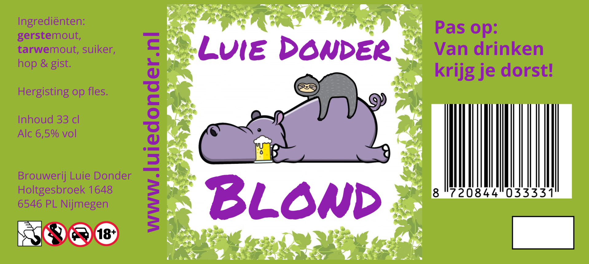 | Luie Donder - Blond 33cl 6,5% | € 2,80 | Pittig, met een hoppige (cascade) nasmaak, drinkt erg makkelijk weg |
