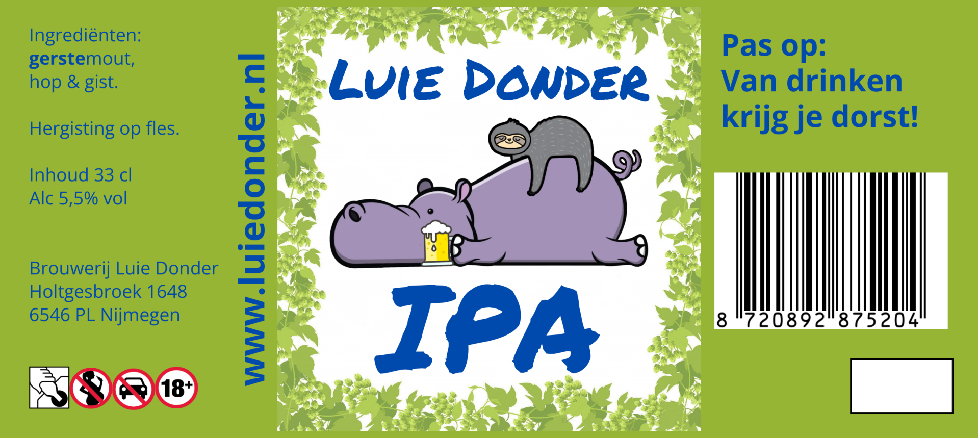 | Luie Donder - IPA 33cl 5,5% | € 2,90 | Fruitige, citrus IPA, American/NEIPA stijl (TIJDELIJK UITVERKOCHT) |