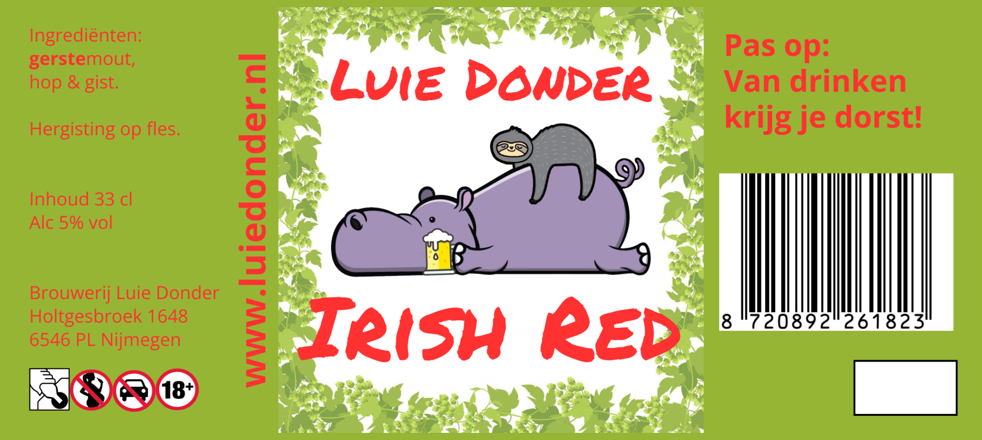 | Luie Donder - Irish Red 5% | € 2,85 | Fris biertje, roodbruine kleur, moutig, met een zuivere frisse afdronk |