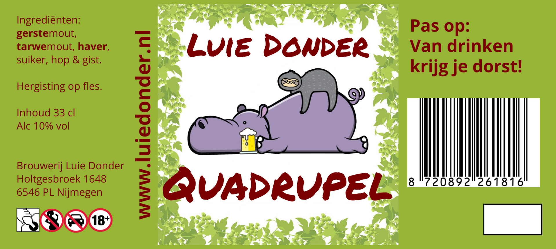 | Luie Donder - Quadrupel 33cl 9,5% | € 2,90 | Donker, zwaar, lichtbitter, klein zoetje met heerlijke hopsmaken |